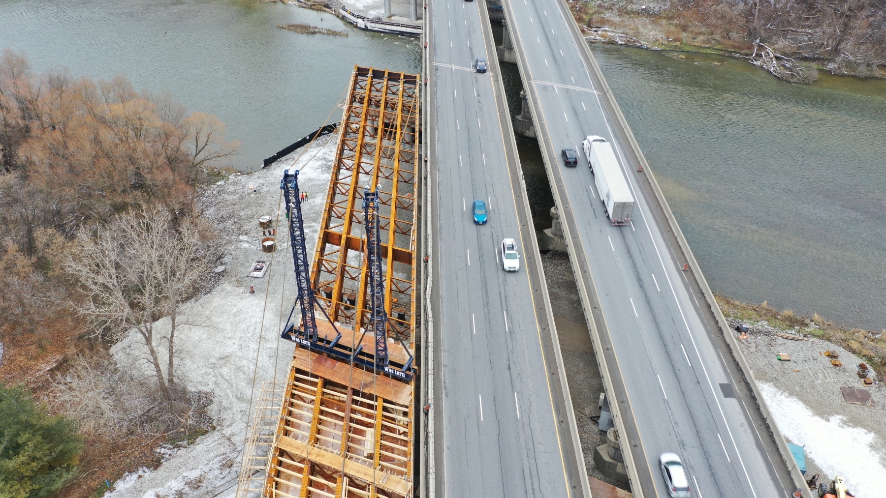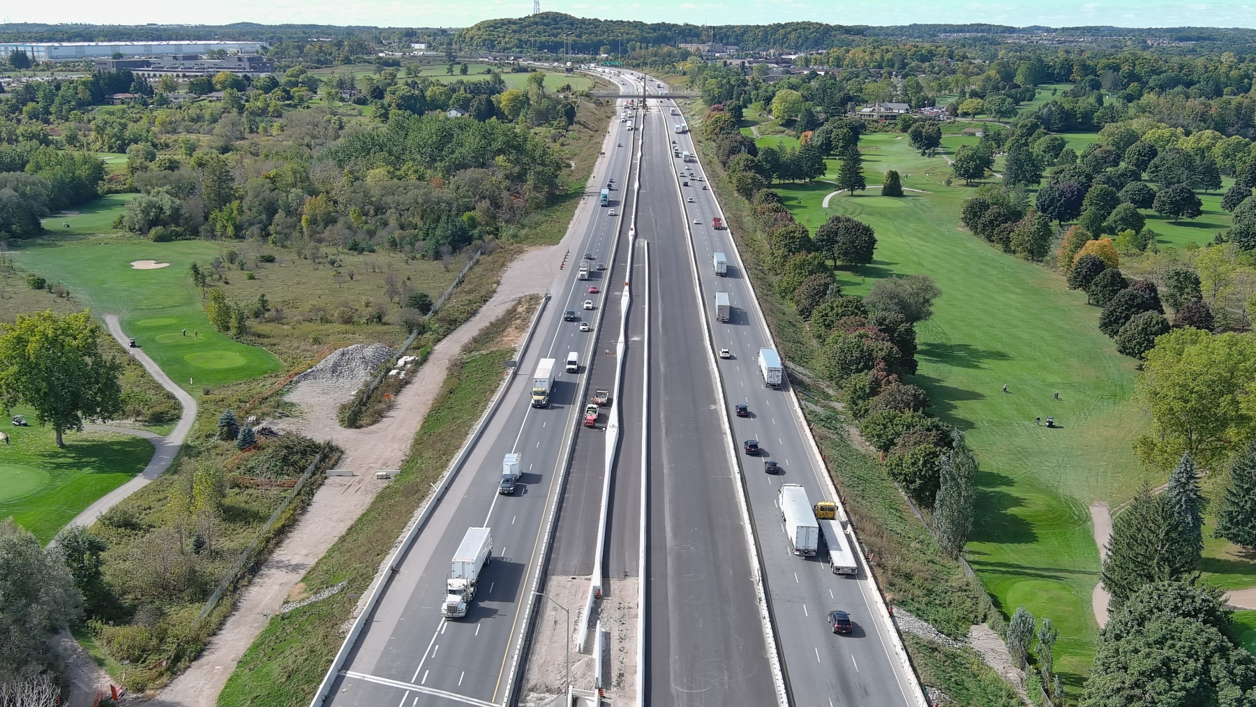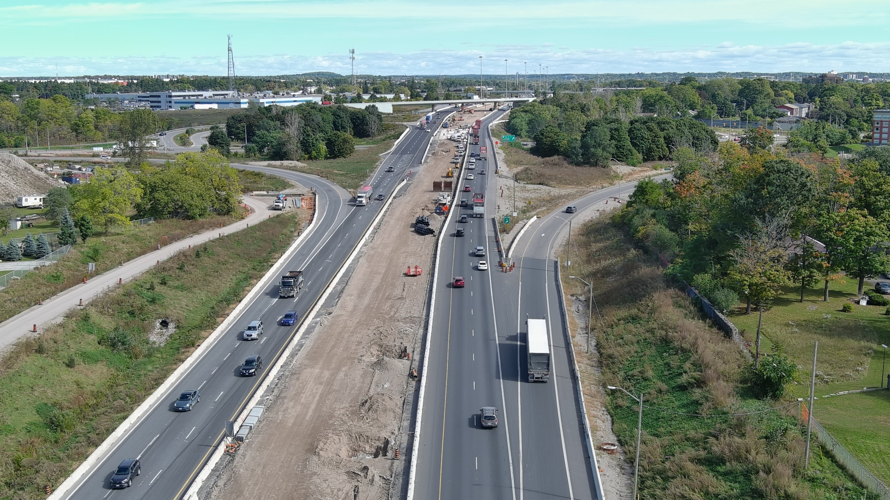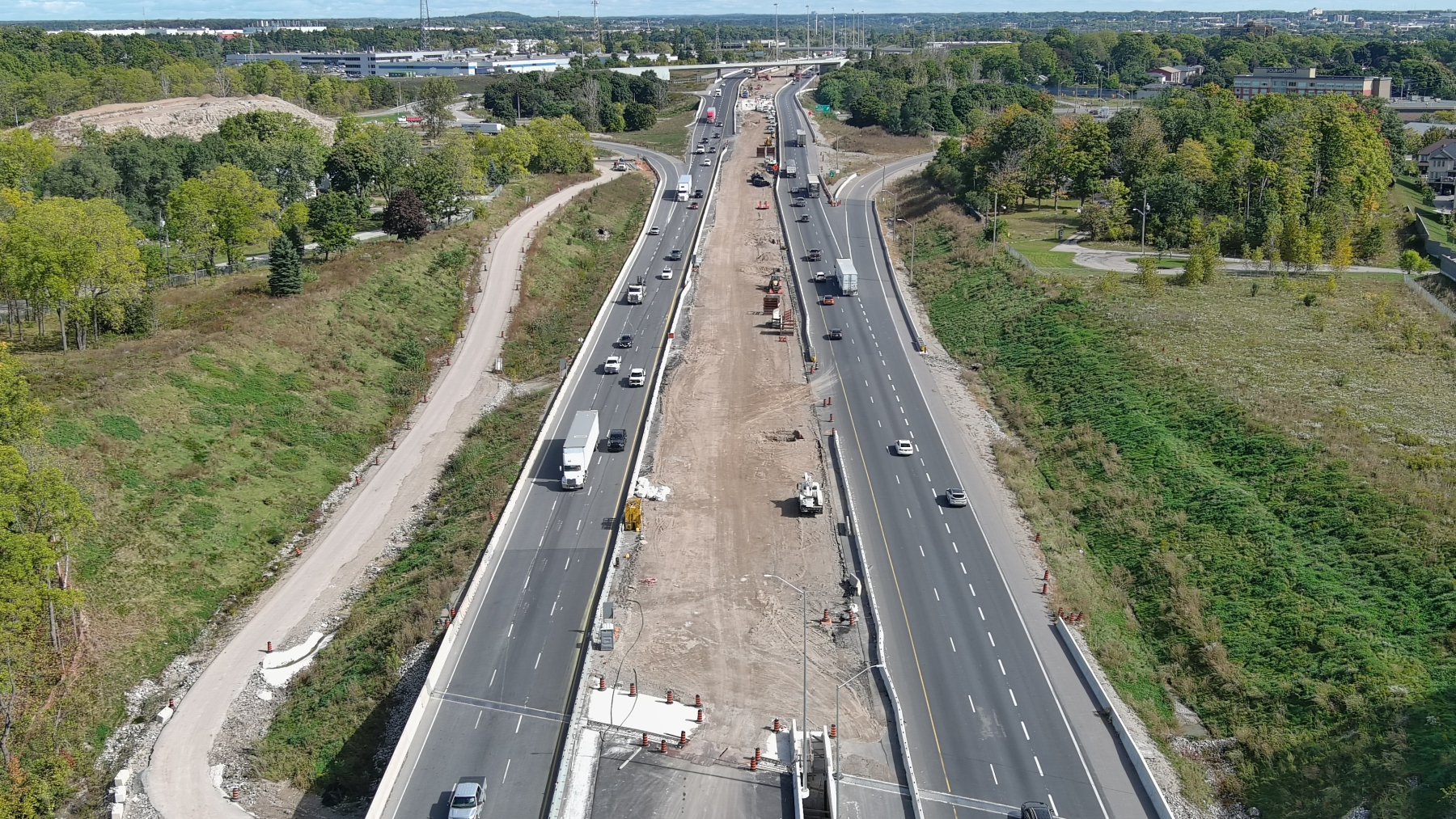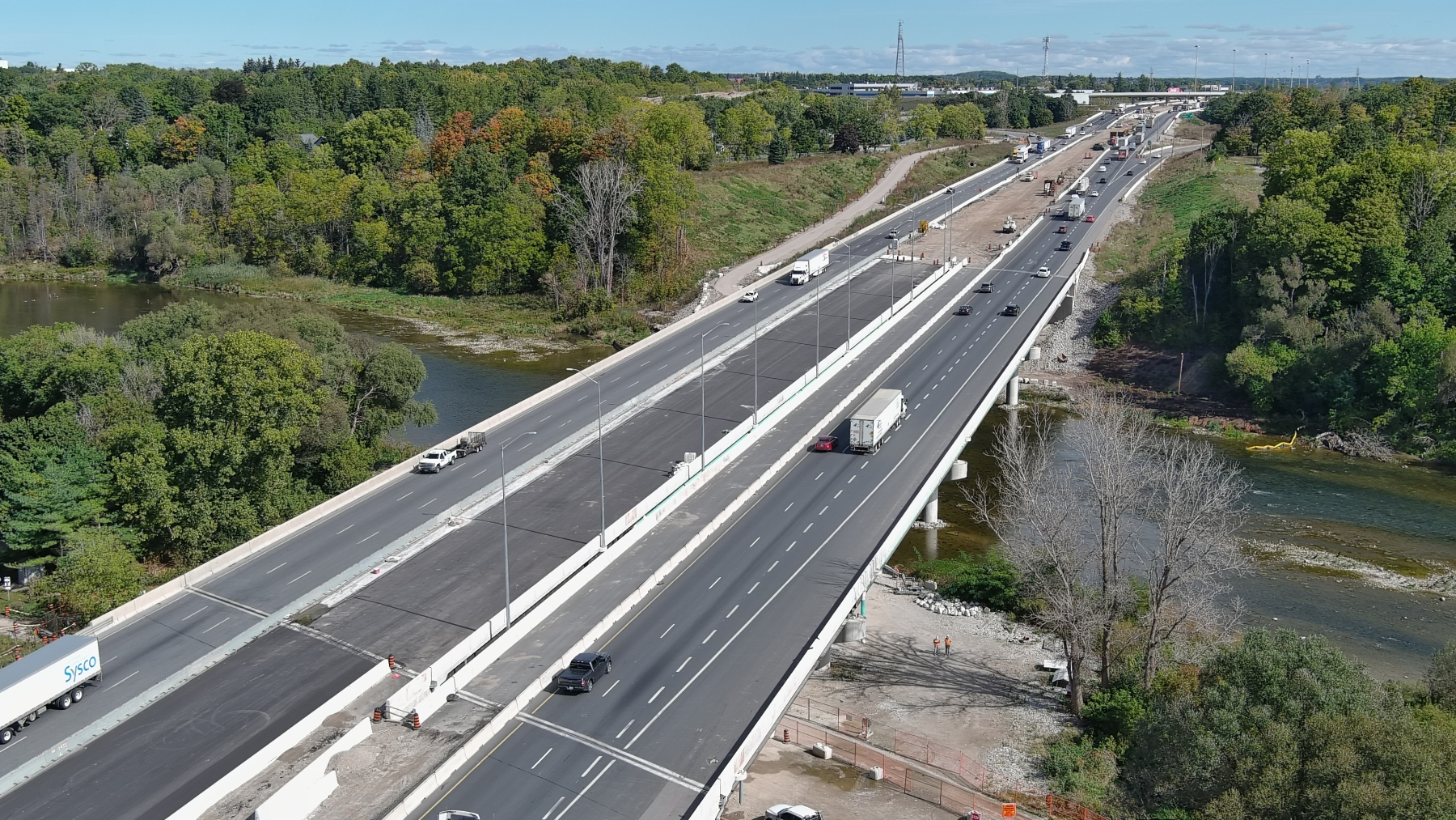 MTO Contract 2020-3001 is for the replacement of the Highway 401 Grand River Bridge and the rehabilitation of the King Street Overpass. Construction commenced in Spring of 2021 and is expected to be completed by the fall of 2025.